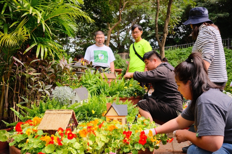 作品以站立於中央的巨大熊為視覺主軸,搭配等比例大小的鋤頭與斗笠,象徵巨人存在的痕跡;六間迷你小屋沿著蜿蜒曲線排列,形成花海中的小鎮聚落。青農們運用官方提供的菊花、海棠與灌木組合,透過色彩配置與高低層次的植栽設計,成功營造出夢幻與現實交錯的視覺故事,展期至12月14日結束,吸引眾多民眾駐足拍照。